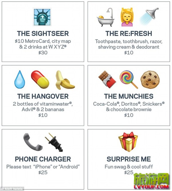 據《每日郵報》報道,美國曼哈頓的雅樂軒酒店(Aloft Hotels)推出一項新的服務,顧客可以通過發送表情符號,加上房間號及顧客姓氏的方式訂購所需物品。   顧客可訂購的物品多種多樣,有單件物品也有套裝,比 ...
