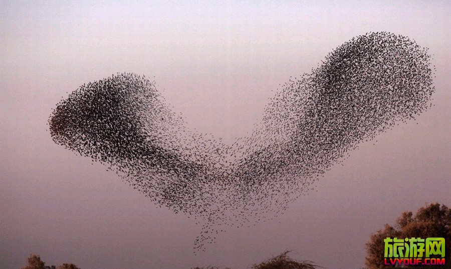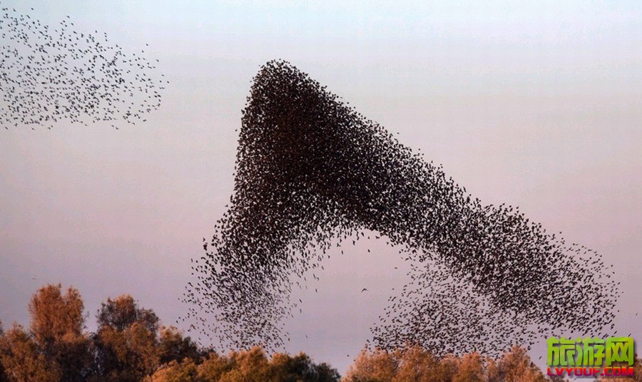 據法新社報道,以色列內蓋夫沙漠北部城鎮Rahat出現一群灰椋鳥,正值日落時分,它們在空中飛舞,組成各種圖形,場面及其壯觀。 以色列境內灰椋鳥空中群舞