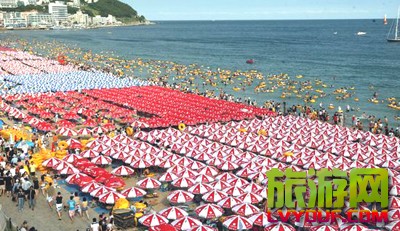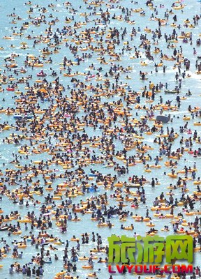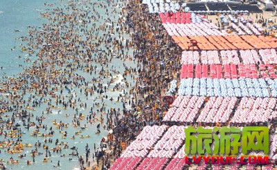 當地時間2009年8月2日,韓國釜山海云臺海水浴場,民眾紛紛涌向這里來度假,十分擁擠。