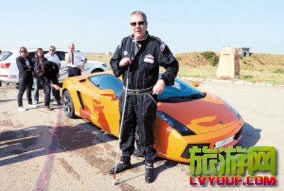 10月11日,在法國東南部的伊斯特爾,比利時盲人呂克(右)站在“蘭博基尼”跑車前留影。 比利時一名盲人11日在飛機跑道上駕駛一輛跑車,時速一度超過300公里,創下新的盲人駕車速度世界紀錄。 ...