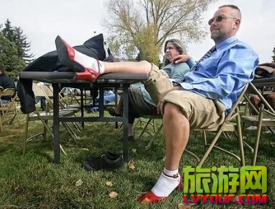 男人們穿上高跟鞋,呼吁人們關注家庭暴力 參加者約翰·賓福特將腳搭在桌子上休息 10月18日,在美國懷俄明州舉行的“穿上她的高跟鞋行走一英里”的活動中,男人們穿上高跟鞋,呼吁人們關注家庭暴力。 ...