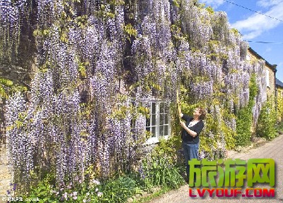 門前盛開“紫色瀑布”,哈利迪夫人正在測量紫藤花的長度 據英國《每日郵報》5月12日報道,居住在英國多希特郡的哈利迪夫婦10年前購入了一些紫藤并將它們種植在自家房屋外。該植物今年又迎來了開花的季節 ...
