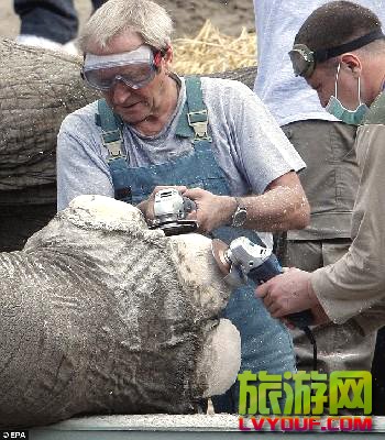 戴著眼罩的獸醫用電磨為大象修剪腳趾甲 人類愛美要做美甲護理,烏克蘭的一頭大象最近也享受到了美甲的待遇。據英國媒體5月25日報道,烏克蘭首都基輔動物園近日專門從國外請來多位“美甲師”給園中的一頭 ...
